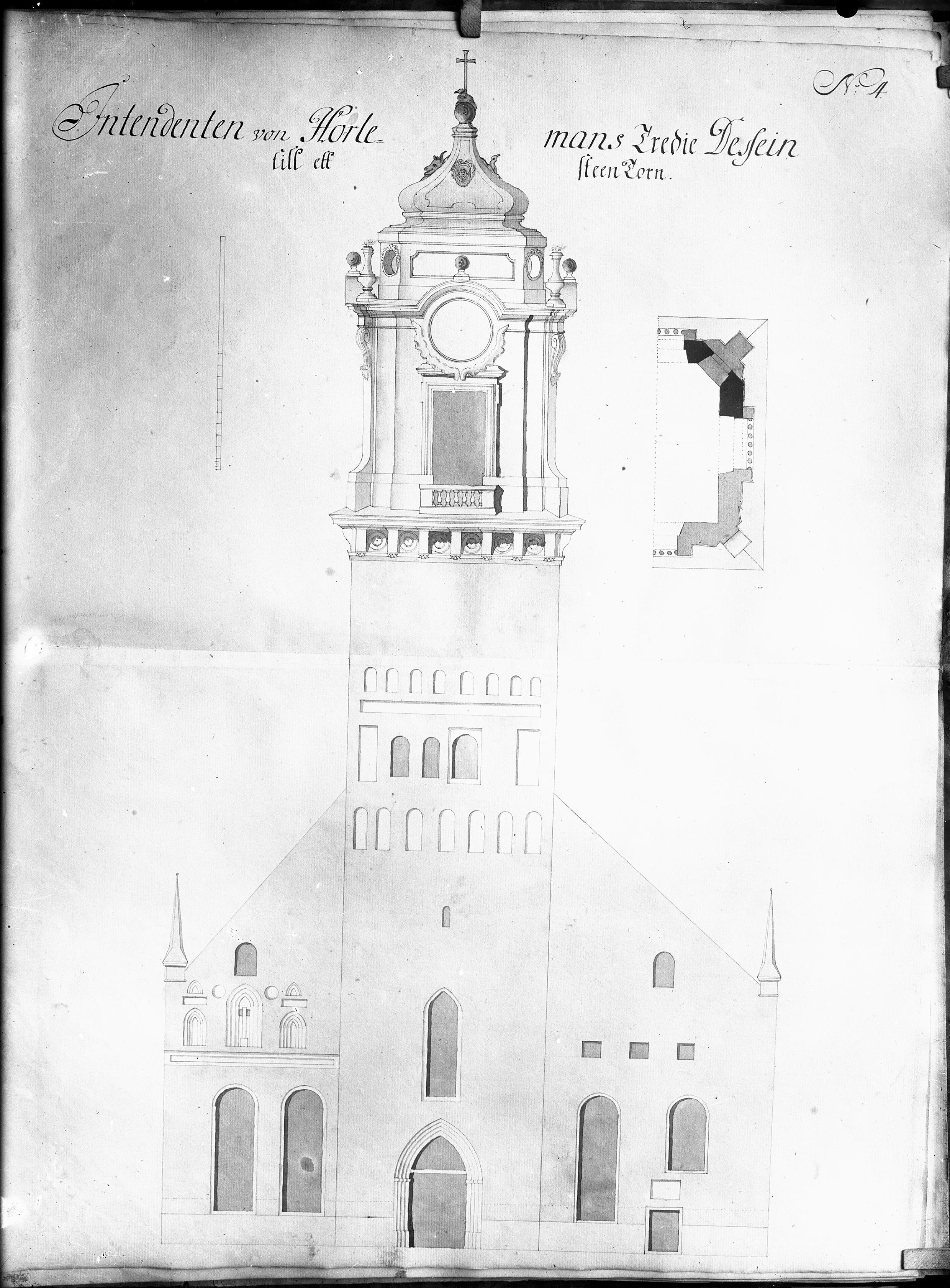 Förslag till ombyggnad av västtornet, foto efter ritning av Hårleman.