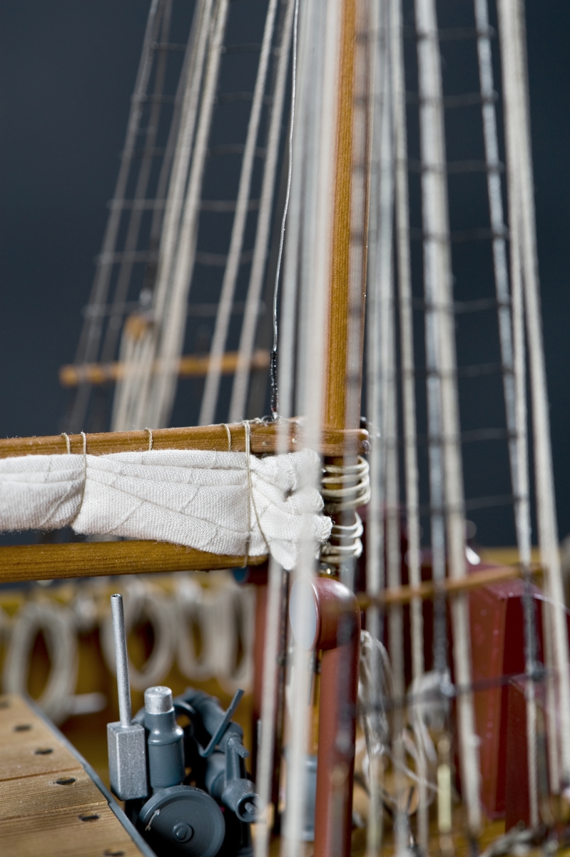 Detaljbild av modell av tremastskonaren BALTICA, byggd i Sjöhistoriska museets modellverkstad av Stefan Bruhn och Jan Claesson