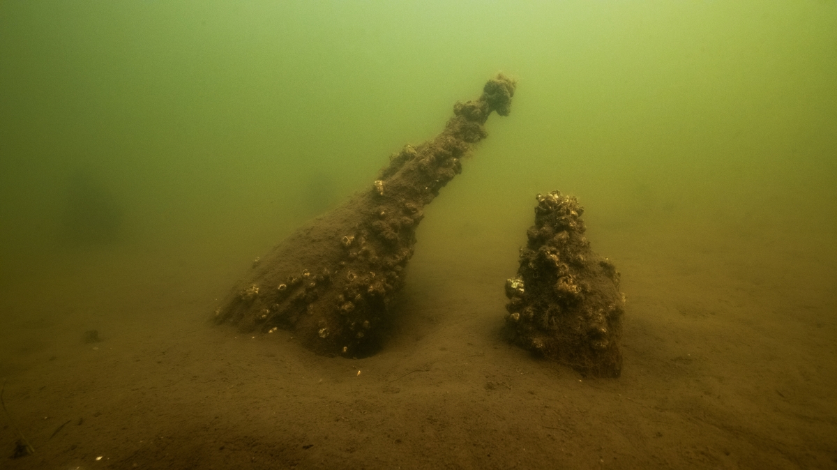 Två pålar av ek. Den lutande kan i dålig sikt mycket väl ha misstagits för en eroderad skeppsdel.