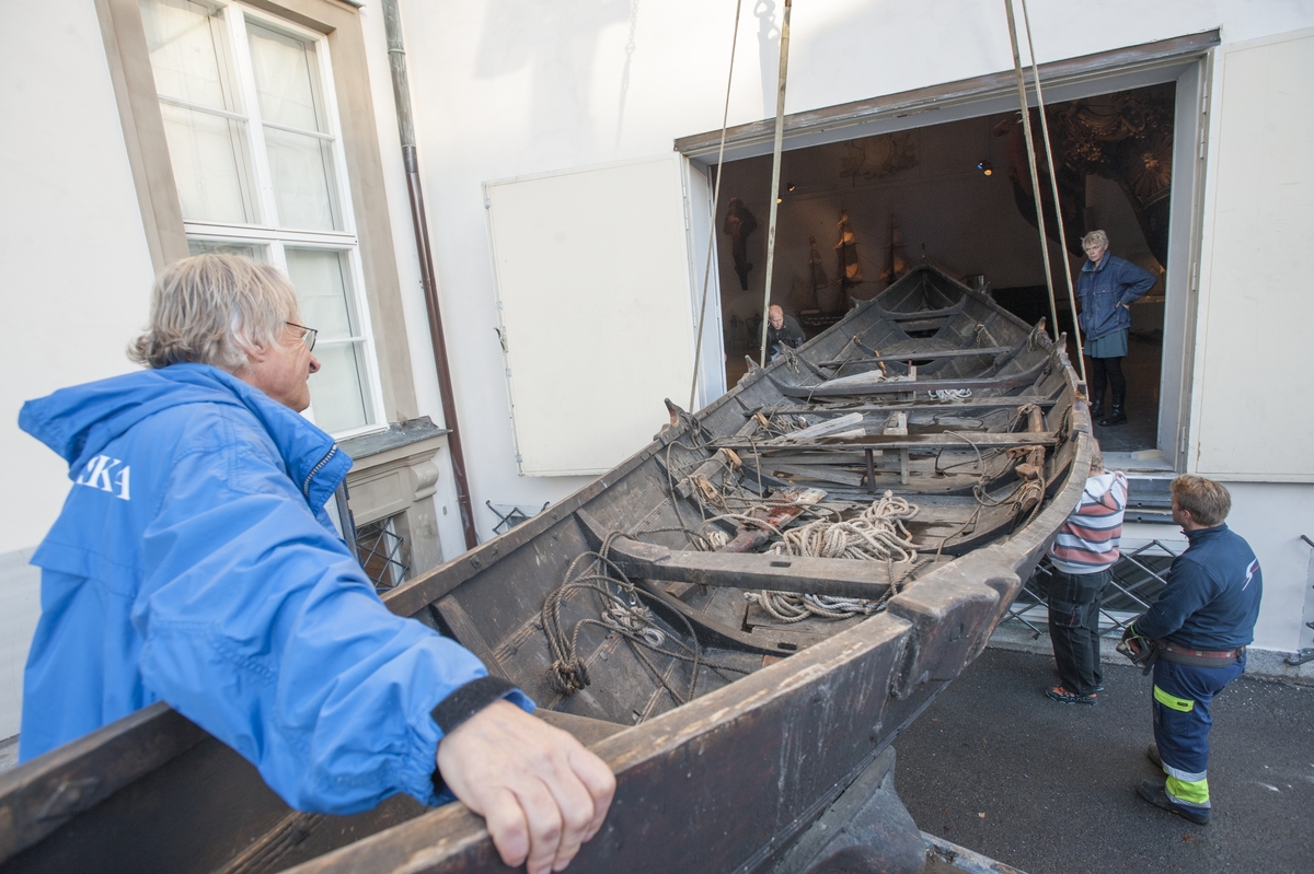 Vikingabåt TÄLJA lyfts in i Minneshallen på Sjöhistoriska inför höstlovet 2013