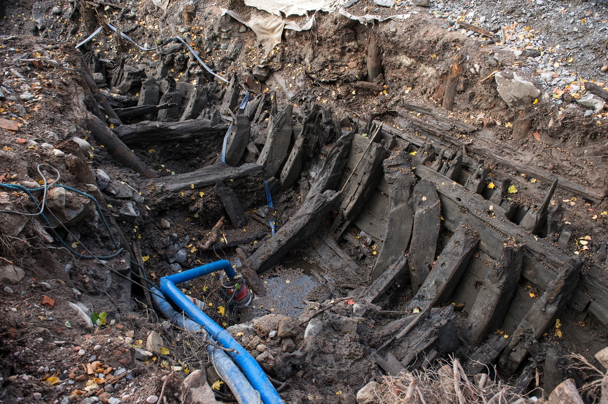 Titel: Vrak hittat sommaren 2017 under kajrenovering på Skeppsholmen, Stockholm. Har identifierats som Gustav II Adolfs flaggskepp Scepter (Spiran), sjösatt 1615. Skeppet deltog i flera sjötåg under kungens eget befäl innan det kasserades och återanvändes som utfyllnad vid anläggningar på Skeppsholmen år 1639.