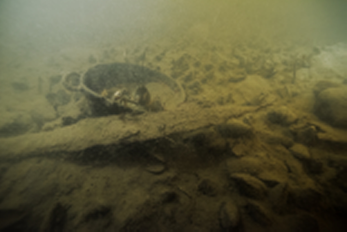 Bilden visar ett intakt kokkärl liggandes på bottnen med en kräfta i.
