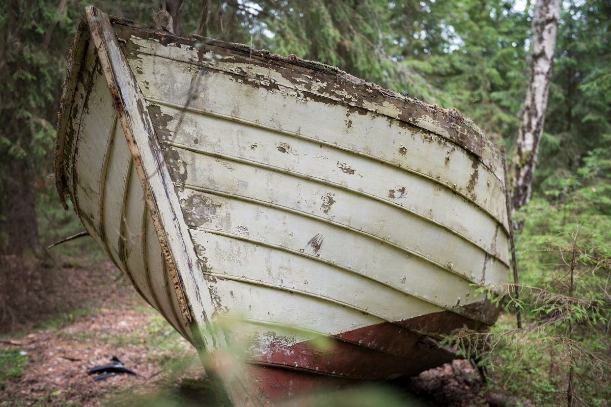 Förfallet vrak av baltisk flyktbåt i skogen på Järflotta. År 1943 användes båten av en grupp på fem för att fly från det Nargö och det ockuperade Estland till Sverige.
