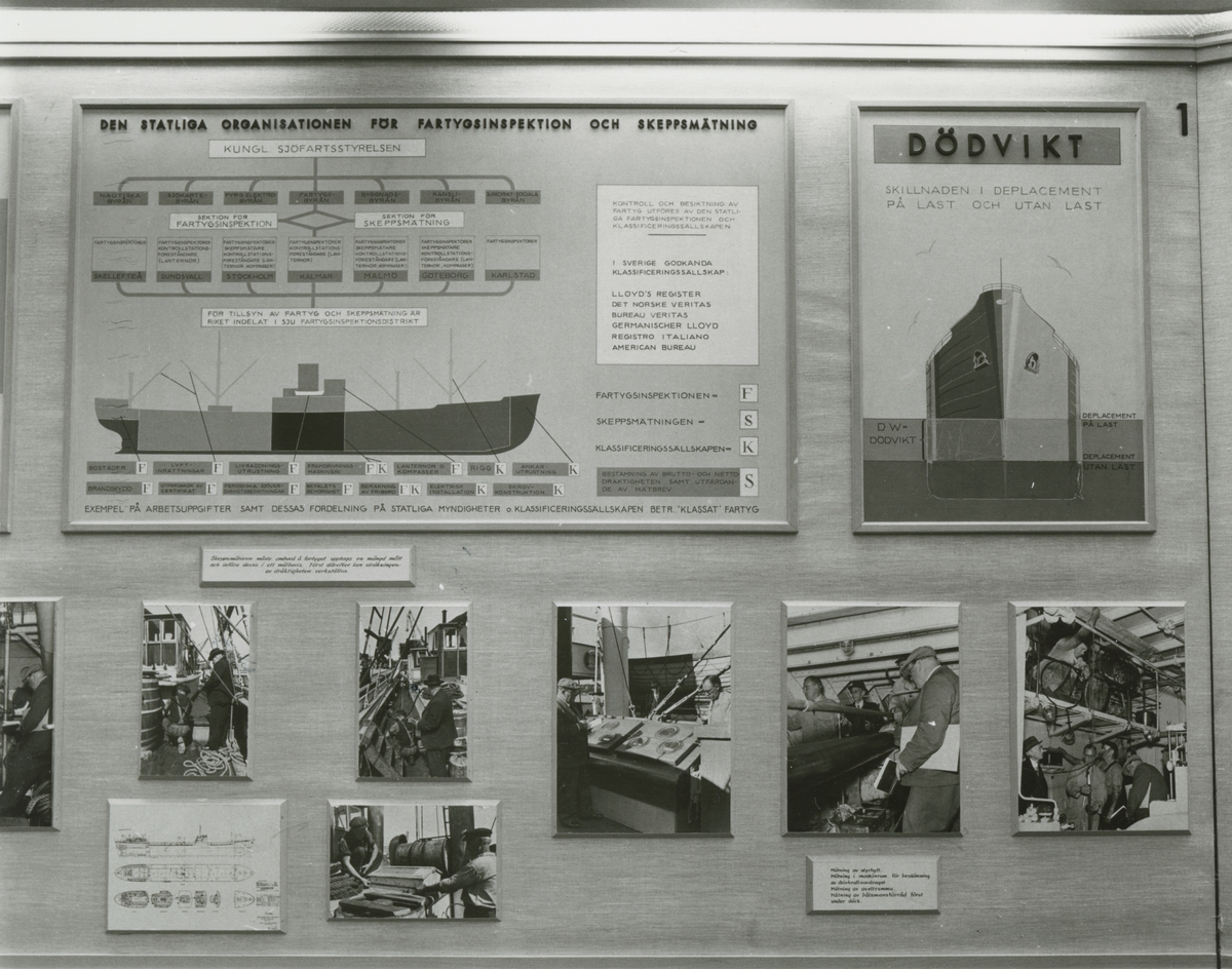 Sjöhistoriska museets permanenta utställning fotograferad 1987. Informationstavla om den statliga organisationen för fartygsinspektion och skeppsmätning samt en förklaring av begreppet dödvikt.
