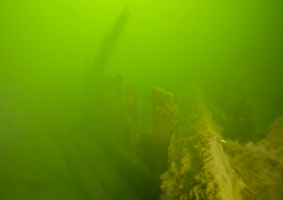 Styrbordssidan på Maria. Sannolikt har skeppets första berghult suttit strax ovan den bevarade bordläggningen på bilden. Detta avslöjar också var, vilken nivå på skrovet man befinner sig.