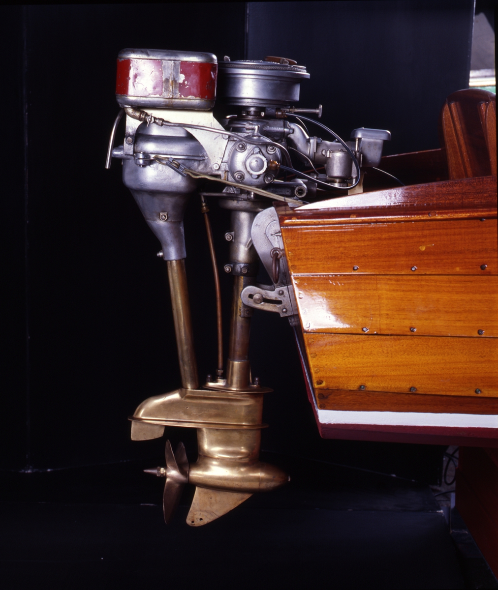 Electrolux campingbåt i Sjöhistoriska museets samlingar. Akter med utombordsmotor.