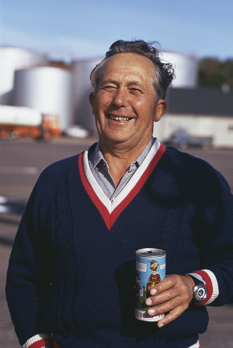 Axel Holm, dansk seglare som köpte nr Albin Ballad nummer 1000, på besök vid Albin Marins anläggning i Kristinehamn. I handen håller Holm en burk Tuborg-öl.