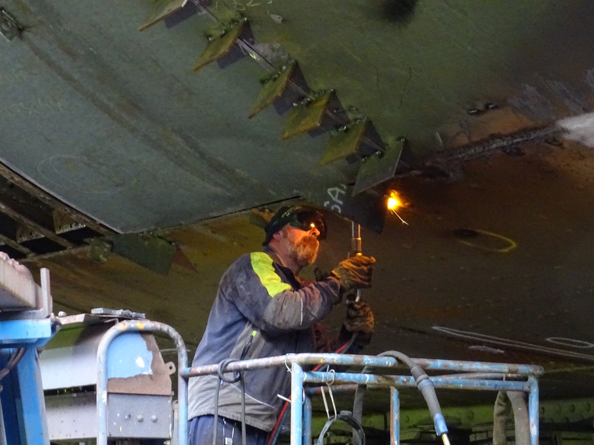 Titel: Isbrytaren SANKT ERIK på Stockholms Reparationsvarv. Svetsarbeten på skrovet.