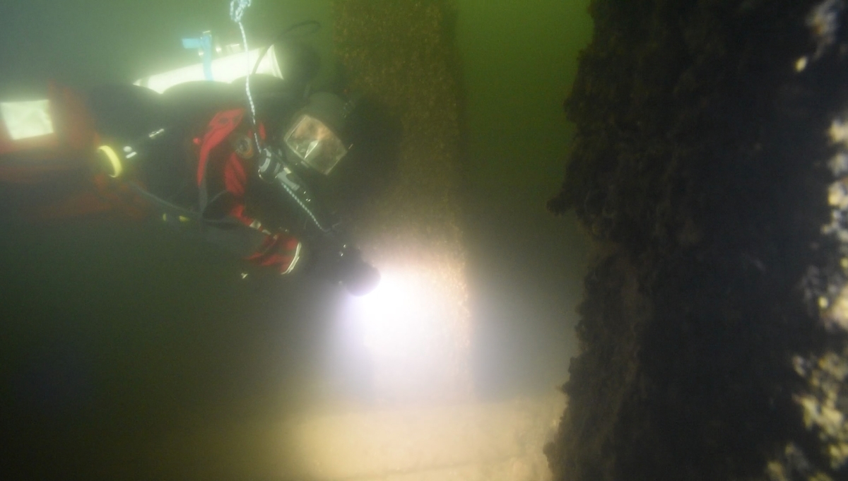 Fyra kraftiga timmer, som möjligen kan vara den bärande konstruktionen för byssan.. (V1/RAÄ Karlskrona 99)