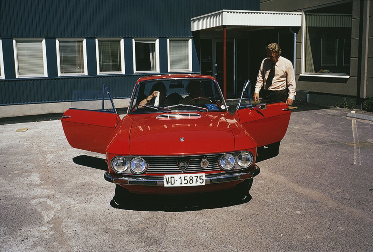 Man vid en personbil, Lancia Fulvia, utanför Albin Marins lokaler i Kristinehamn.
