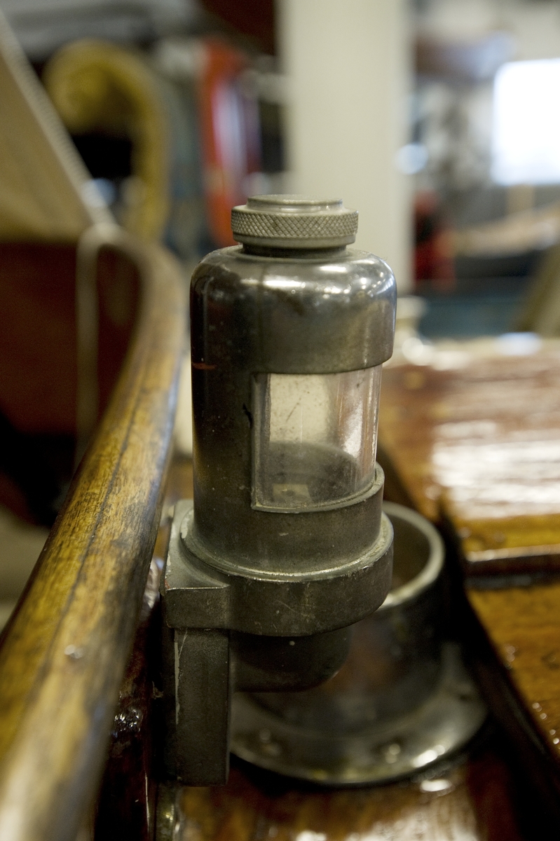 Akterlanterna av kromad mässing från Petterssonbåten WIKING X. Typen populärt kallad pillerburk.