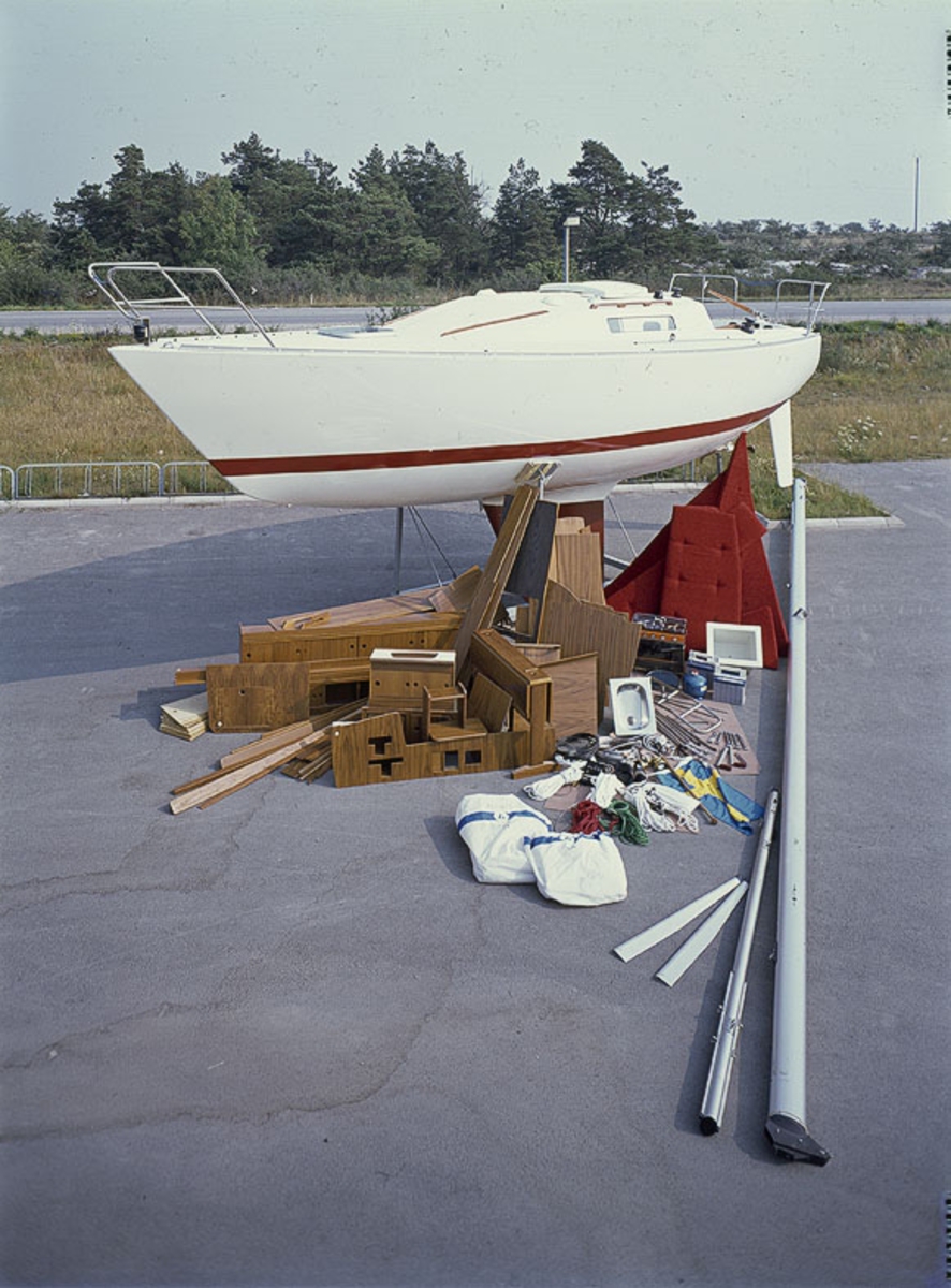 Albin Cumulus i 3/4-fabrikat på land, med inredningsdetaljer på marken.