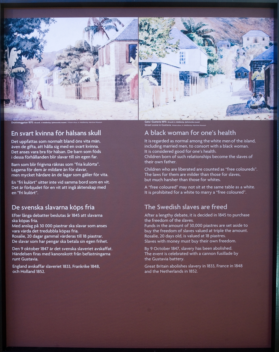 Vandringsutställningen "En dunkel historia" om den transatlantiska slavhandeln. Skylt med utställningstext.