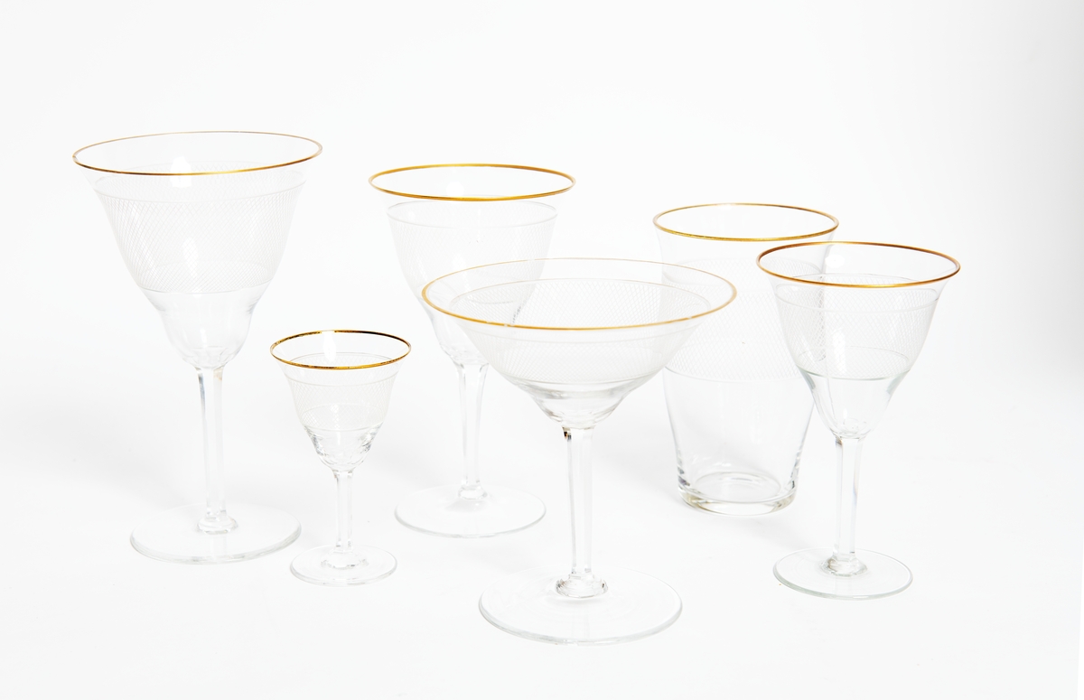 Glasservis i kristall med guldfärgad kant. Packades med på flykt från Estland till Sverige år 1944.