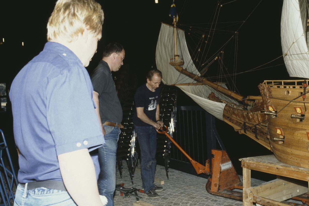 Modellen av Vasa i skala 1:10 justeras på plats i Vasamuseet. Fr.v. närmast Lars Thorhagen, Carl-Gunnar Olsson och Göran Forss.