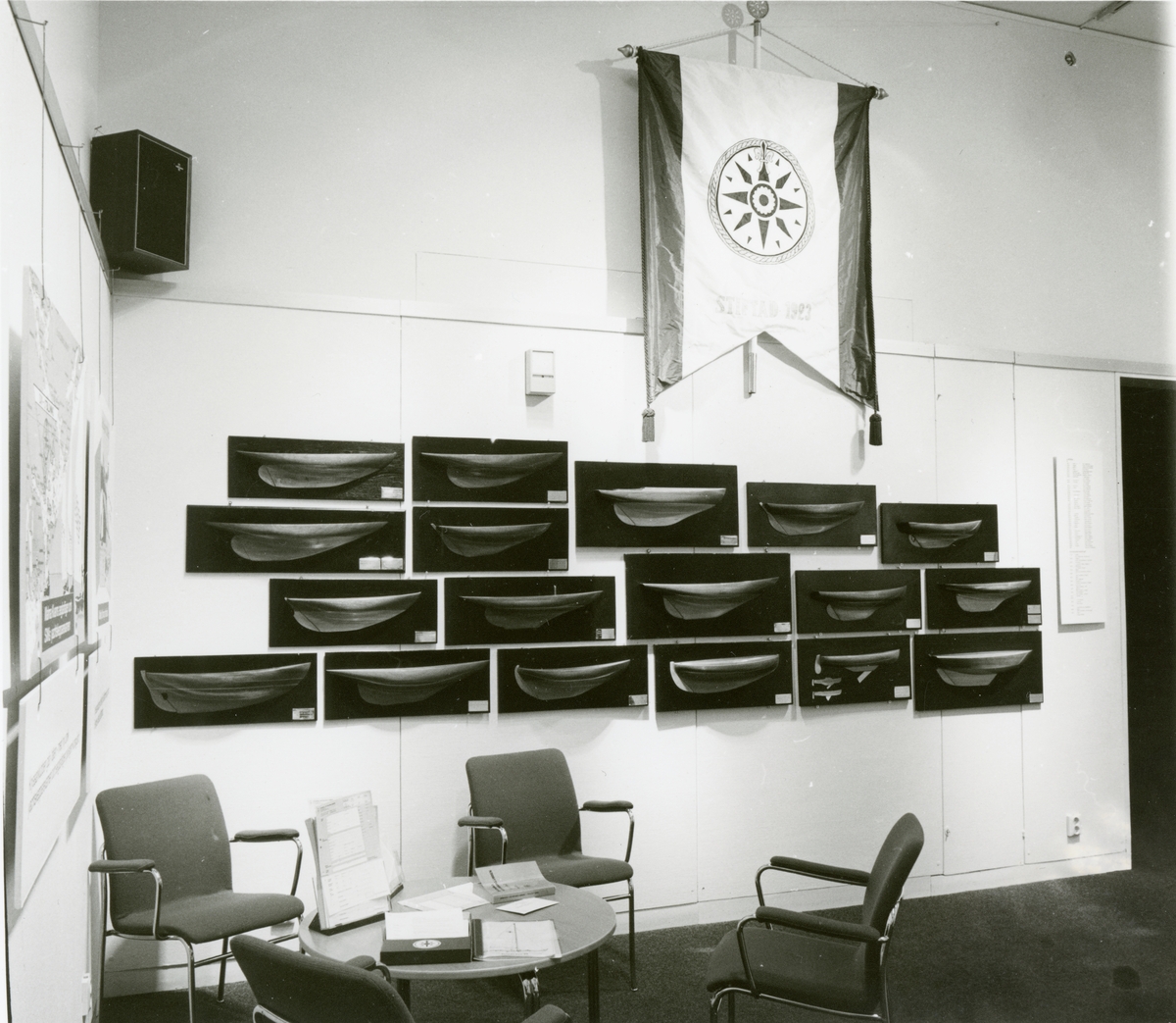 Utställningen "Svenska kryssarklubben 60 år". Sitthörna där man kan skriva in sig som medlem. Medlemsflagga samt halvmodeller visas på väggen.
