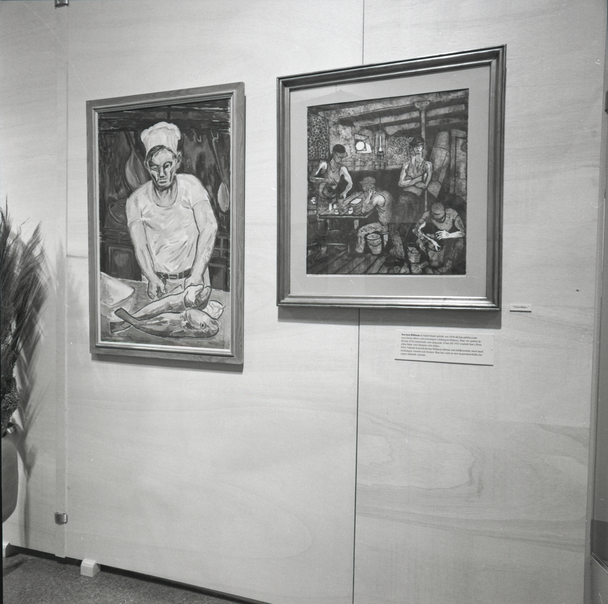 Utställningen "Sjömanskonst". Del av utställningen som visar två målningar föreställande sjömän i arbete av Torsten Billman.