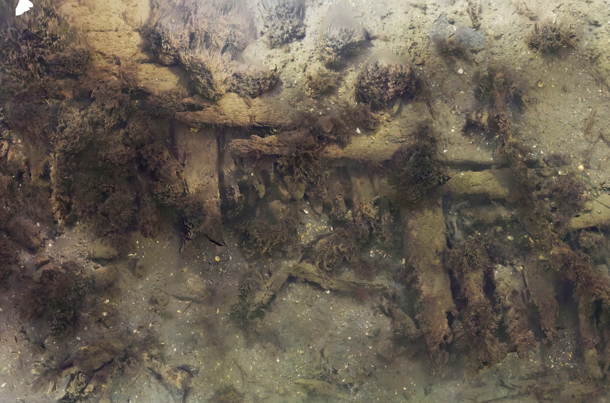 Ett cirka fyra meter långt uppförstorat område av 3D-fotogrammetri av ID 5. De tätt sittande bottenstockarna (20-27 cm breda) och innergarneringen syns. Delar av fartygslämningen är som synes översedimenterad.