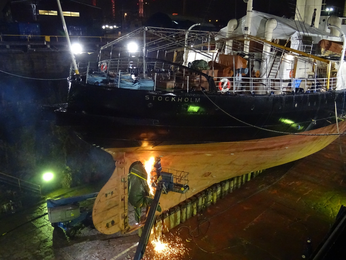 Isbrytaren SANKT ERIK i kvällsbelysning på Stockholms Reparationsvarv.