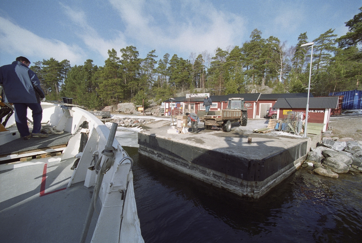RAMSÖ lägger ut från Ahlsvik, Svartsö. Lossade varor på bryggan.