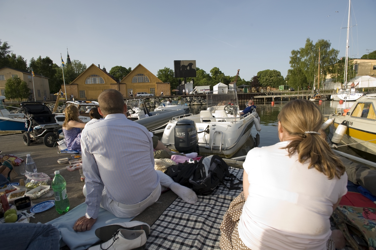 Titel: Tre seklers flaggskepp, maj 2008. Båt in bio i Wasahamnen, visar "Pirates of the Carribean"