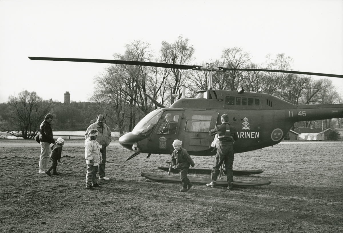 Aktivitet utanför Sjöhistoriska museet i samband med utställningen "Ubåtar, finns dom". Marinens Helikopter 6B (Agusta-Bell 206) visas upp.