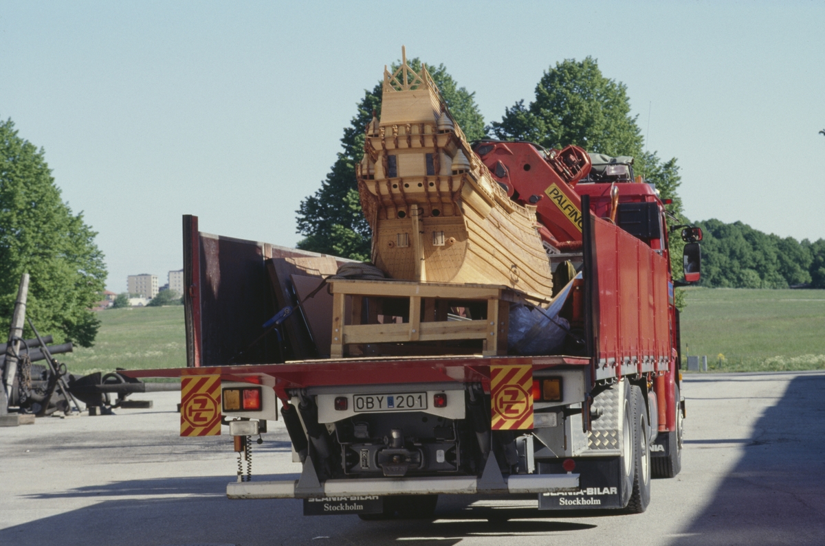 Vasamodellen i skala 1:10 flyttas från Sjöhistoriska museet till Vasamuseet med lastbil.
