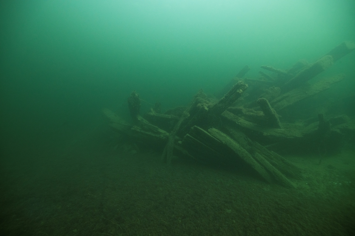 Förstäven lutar åt babord. Bordläggningen finns delvis bevarad och