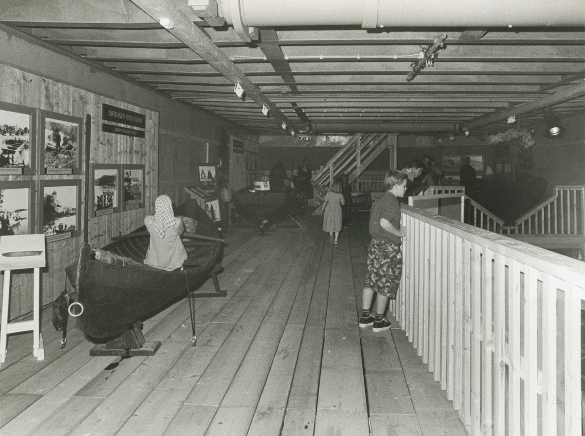 Utställningsinteriör från fartyget M/S NORDWEST som turnerade med utställningen "Människor och båtar i Norden". Producerad av Riksutställningar och Sjöhistoriska museet. I förgrunden ELMA och Savolaxbåten från Saimen.