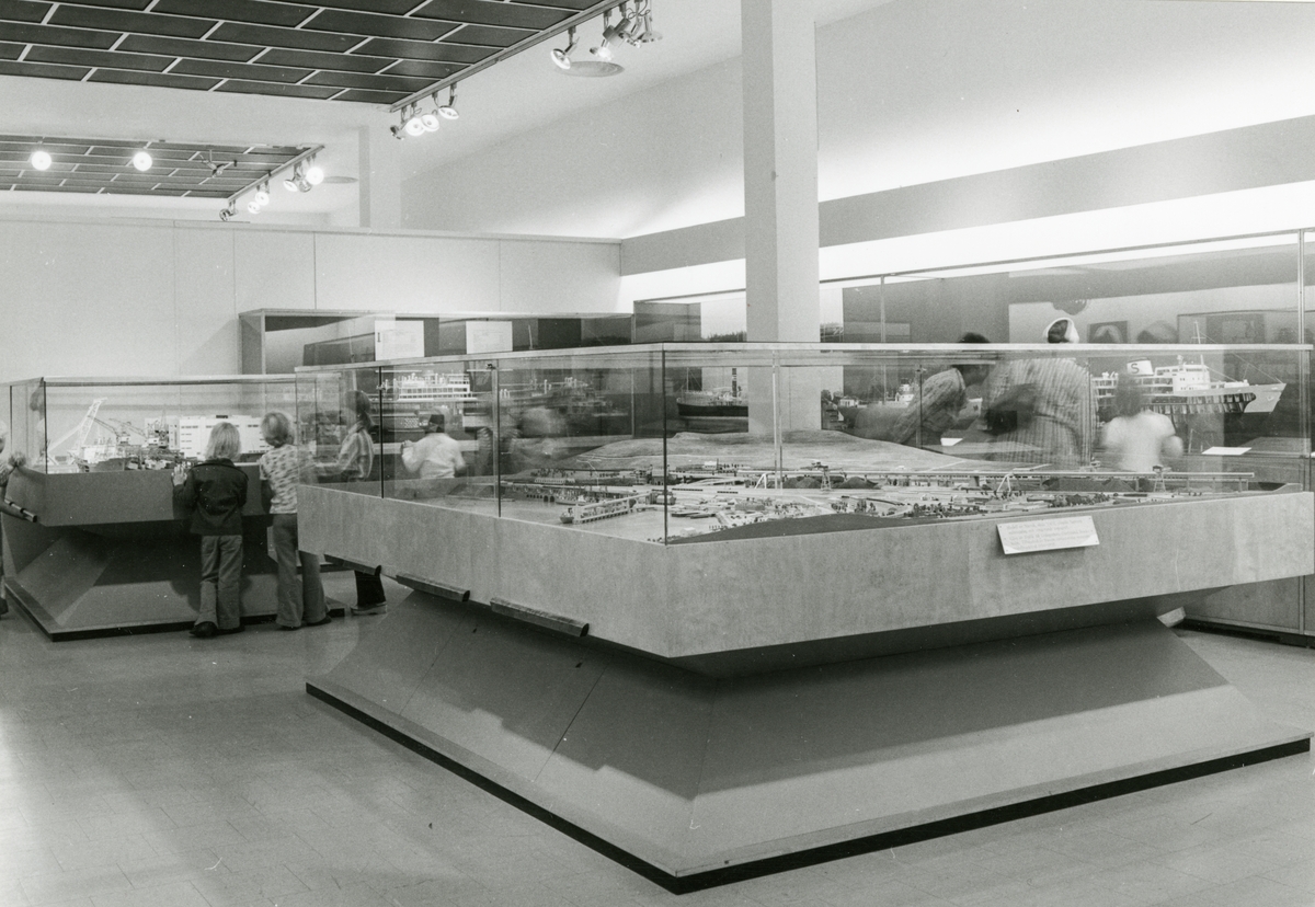 Utställningen i Rederisalen. Tillfällig uppställning av en del i rederisalsmaterialet. Barn tittar på en hamnmodell. Andra tittar på montern. Personerna är i rörelseokärpa.