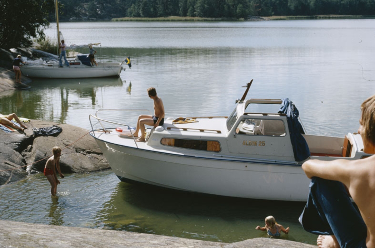 Albin 25 förtöjd i en vik. Marknadsföringsbild.