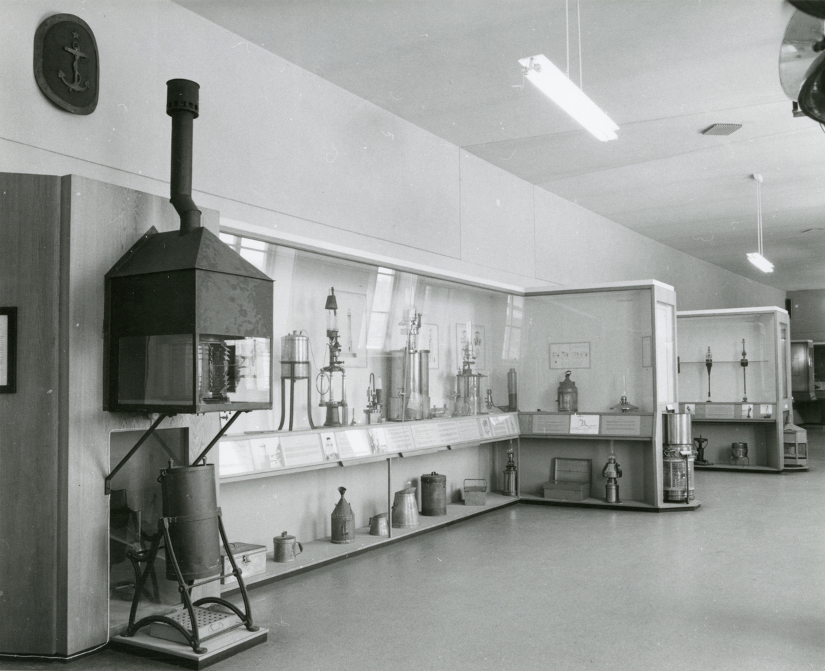 Utställningen "Fyr och Lots" före uppbrytandet 1975. Utställningsinteriör med fyrföremål m.m.
