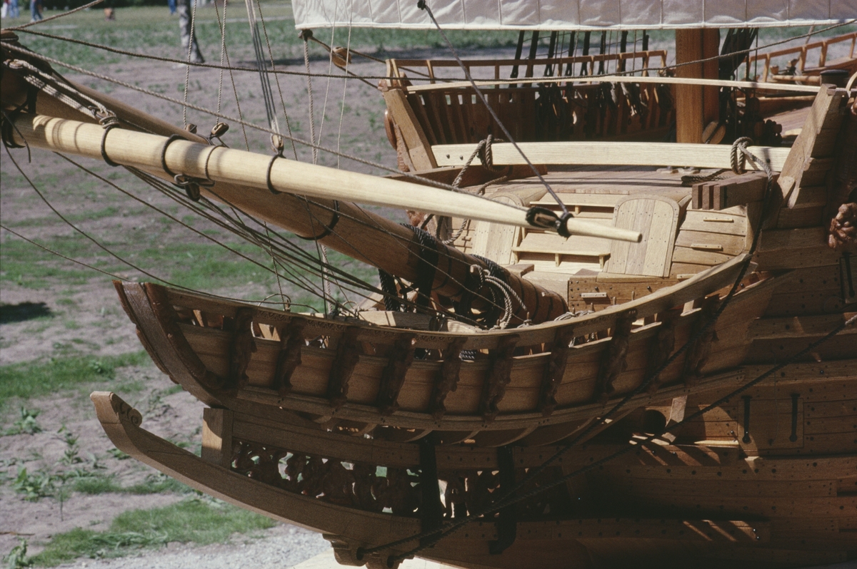 Vasamodellen i skala 1:10 utanför Vasamuseet. Förstäv, galjon.