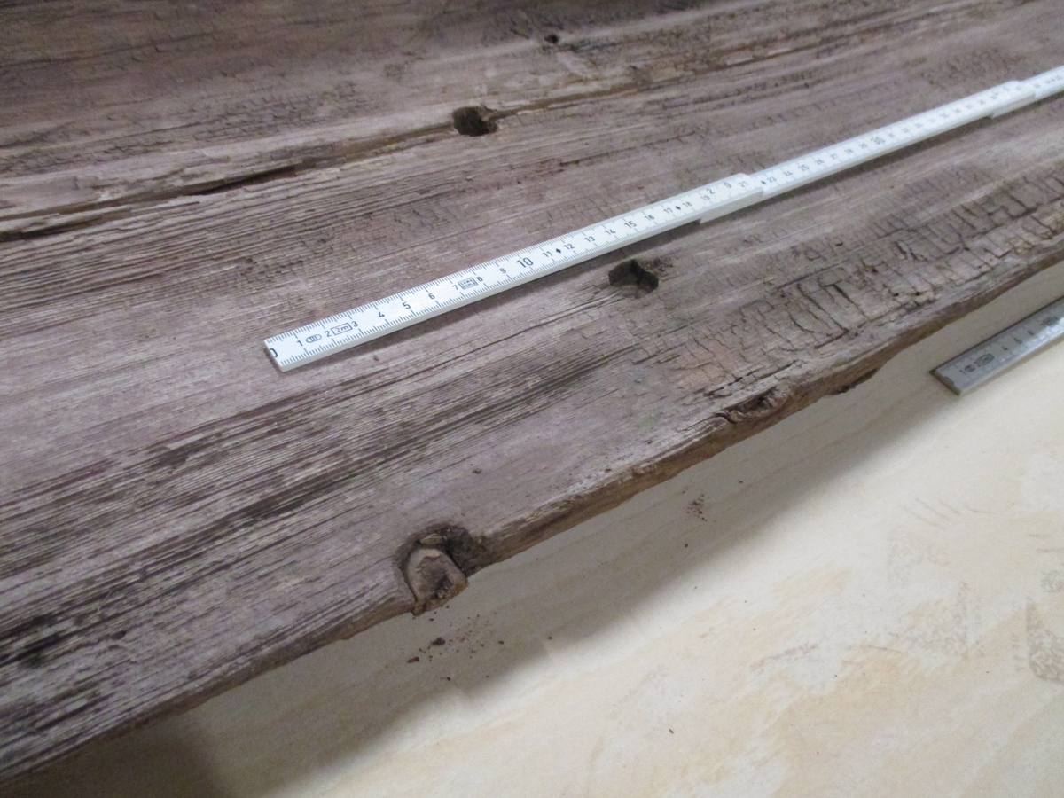 Dymlingshål vertikalt och horisontellt för sammanfogning i stockbåtsbotten (Foto: Charlotte Mejsholm).