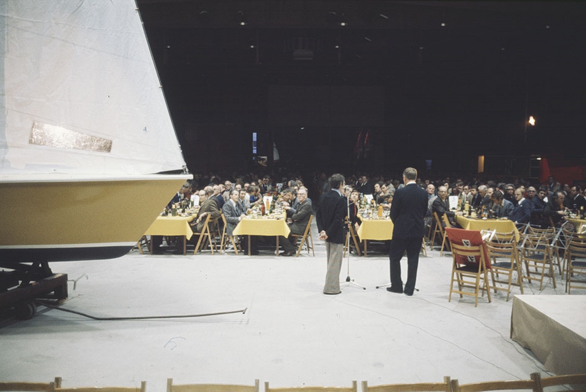 Titel: VD Uno Eriksson och konstruktören Rolf Magnusson presenterar Albin 57 vid invigningen av Albin Marins anläggning i Gustavsvik, Kristinehamn.