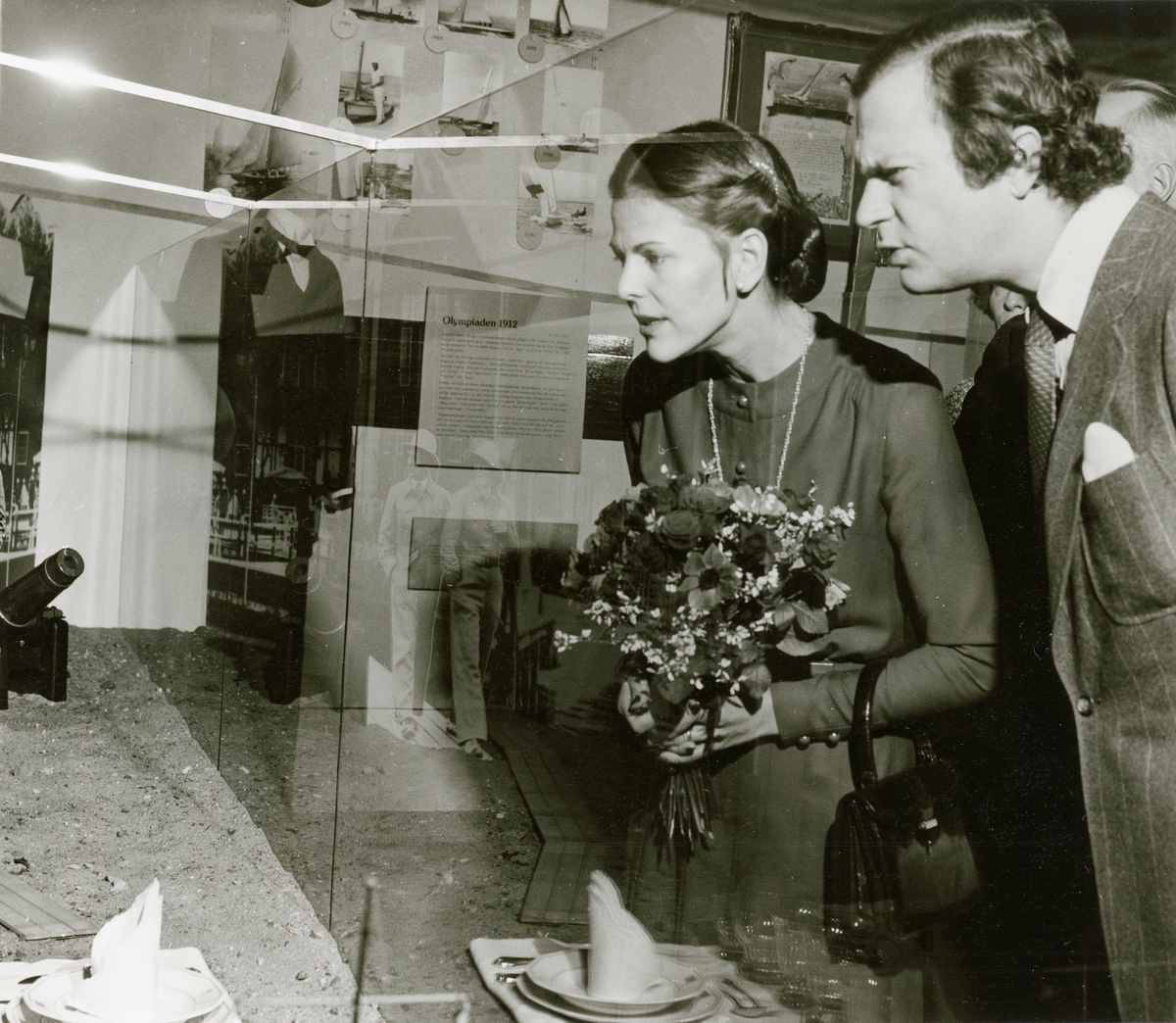 Utställningen "Kungliga seglare och seglande kungar". kungar. Vernissagemingel. Kung Carl XVI Gustaf och drottning Silvia studerar montern "Sandhamnsliv".