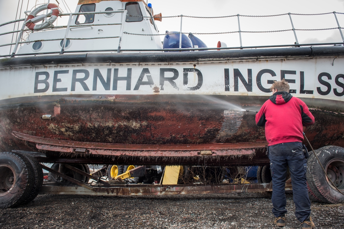 Sjöräddningskryssaren Bernhard Ingelsson bygg 1945. Blästras och målas på Boghammar Marin AB. Lidingö.