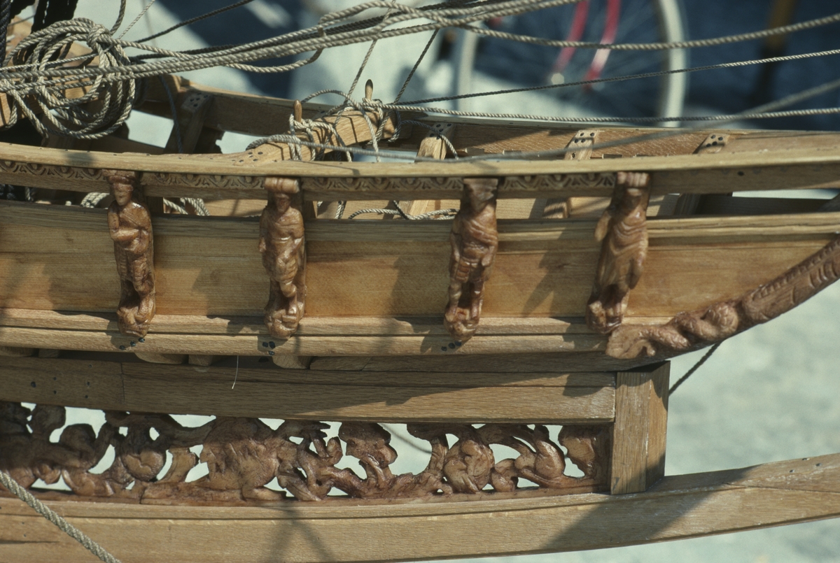 Vasamodellen i skala 1:10. Detalj av galjonen. Den övre delen visar en rad romerska kejsare, på den nedre finns en lång skulpturfris som återger den grekiska sagan om Thetis och Peleus.
