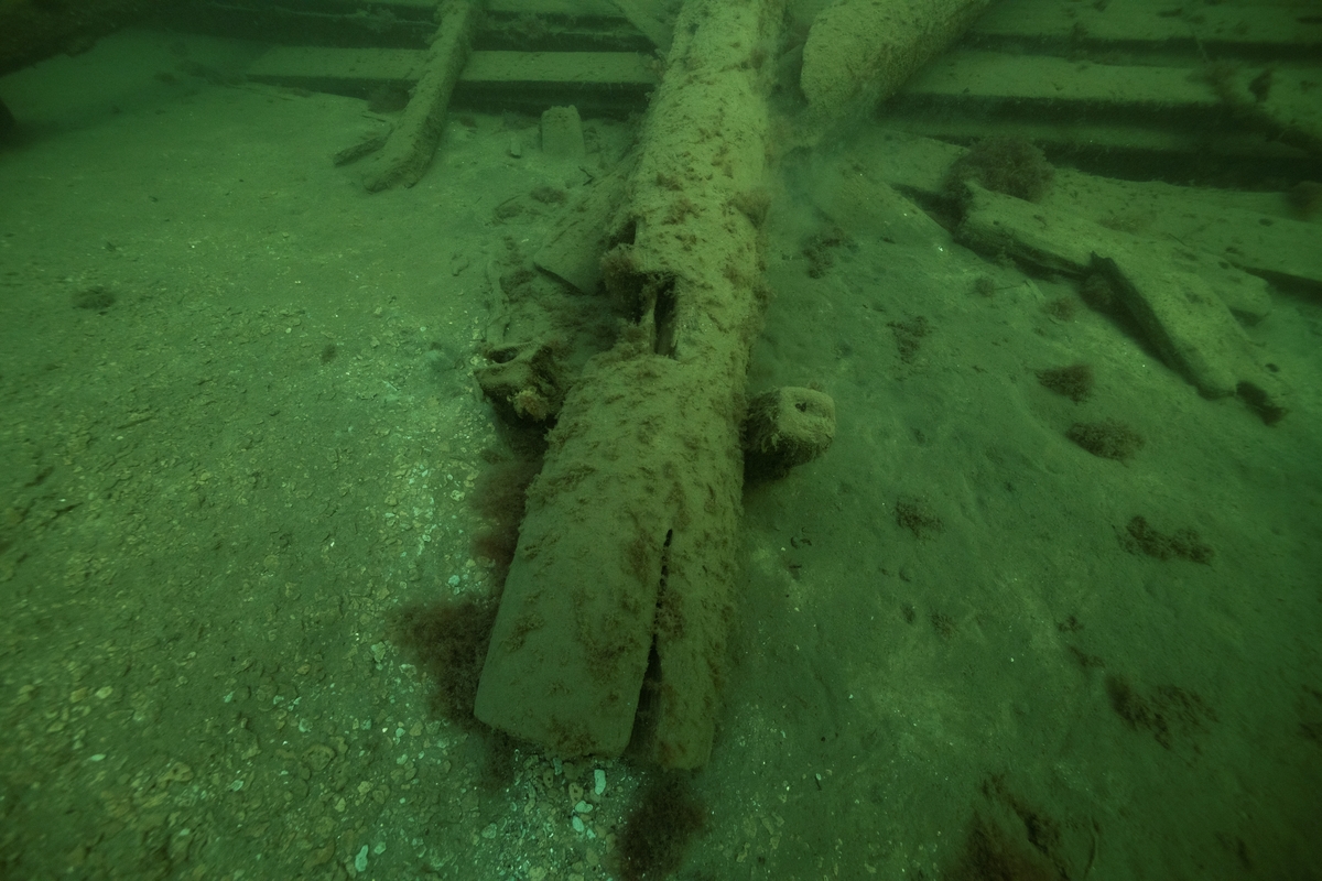 Låsanordningen syns i änden på detta timmer. Två stycken tunnare timmer har fällts in i den kraftigare