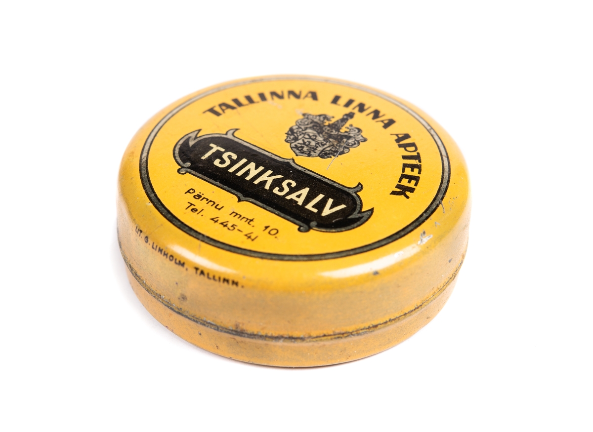 Burk för zinksalva, estnisk. Togs med på flykt från Estland till Sverige år 1944.