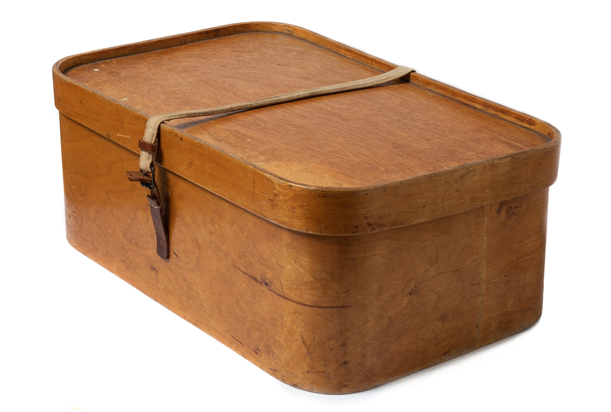 Koffert i plywood som användes under flykt från Estland till Sverige under andra världskriget 1944.