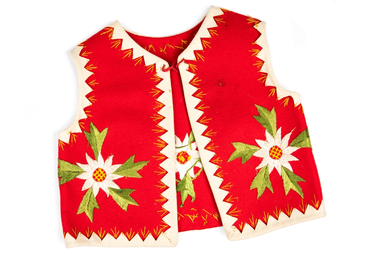 Väst i polska flaggans färger. Köpt i Polen av ett estniskt par som tog med den när de senare flydde från Estland till Sverige år 1944.