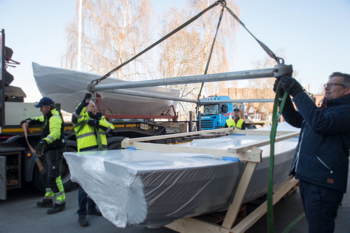 Transport av fritidsbåtar från Båthall 2 till Fritidsbåtsmuseet i Härnösand.