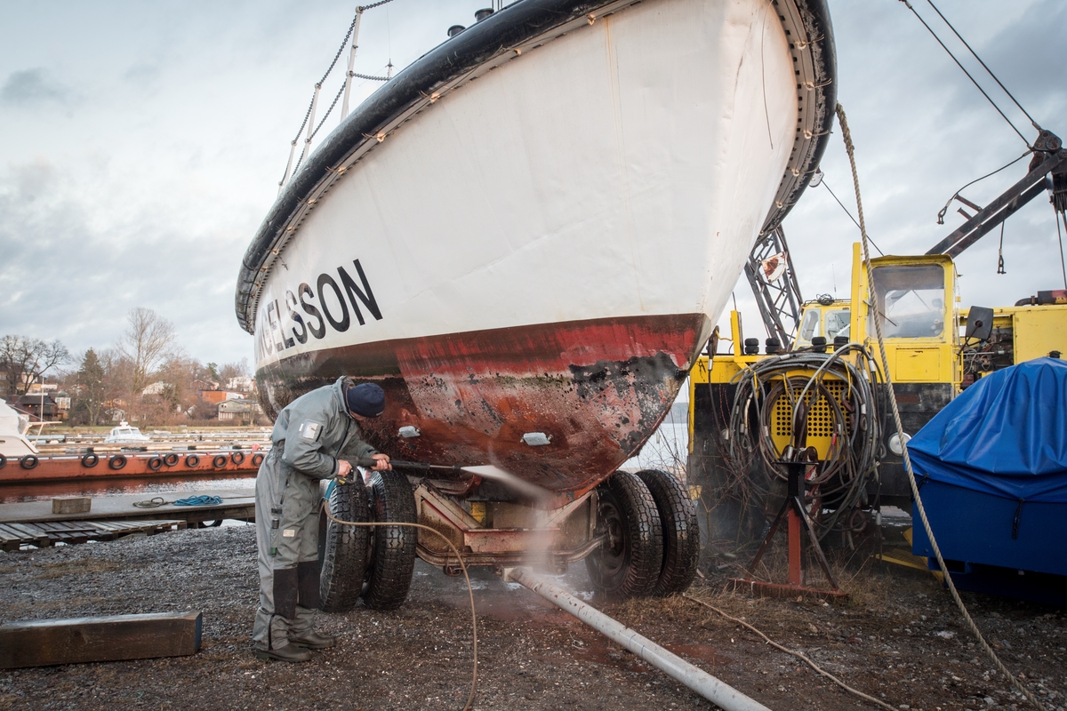 Sjöräddningskryssaren Bernhard Ingelsson bygg 1945. Blästras och målas på Boghammar Marin AB. Lidingö.