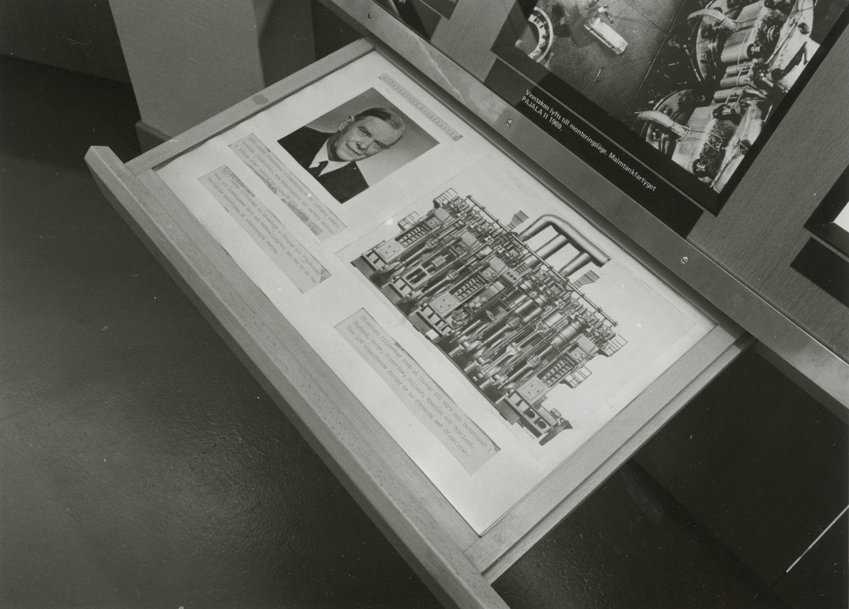 Sjöhistoriska museets permanenta utställning fotograferad 1987. Sprängskiss. Illustration av Götaverkens tvåtakts enkelverkande dieselmotor som konstruerats av maskiningenjör John Olsson.