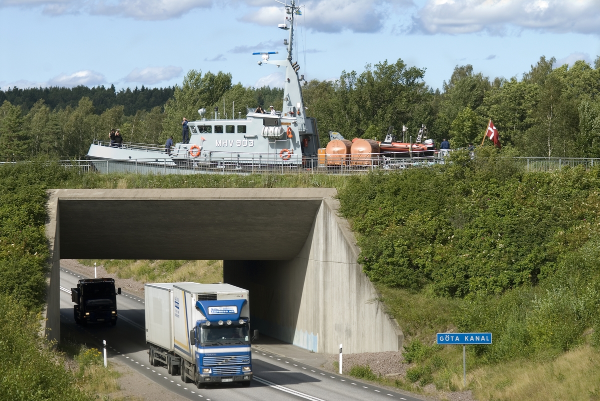 Danska patrullbåten MHV903 Hjortö passerar akvedukten vid Kungs Norrby.