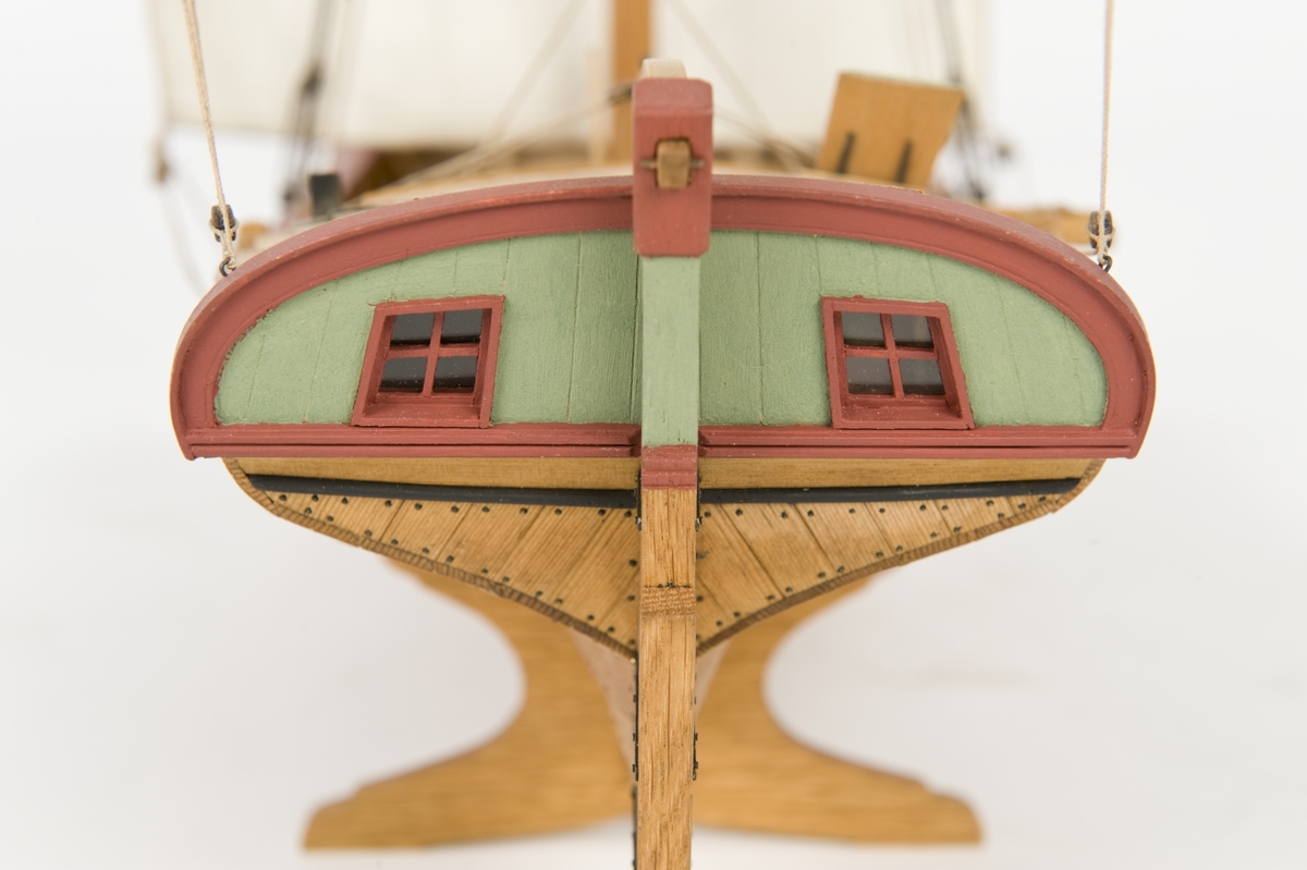 Titel: Modell av mälarjakt från 1700-talet, byggd av Stefan Bruhn i Sjöhistoriska museets modellverkstad. Detalj.