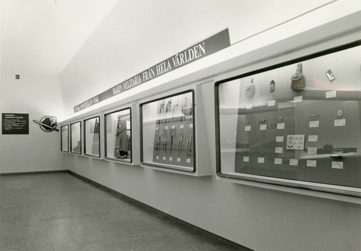 Utställningen "Marina handvapen från hela världen". Svenska vapenstiftelsen visar olika typer av handvapen, militära grader, epåletter m.m. i montrar på vägg.