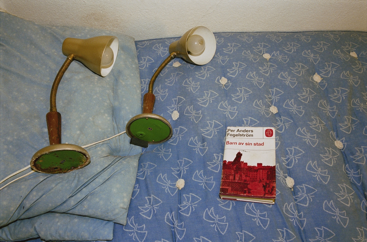 Madrass på vilken ligger två nedmonterade läslampor samt Per Anders Fogelströms "Barn av sin stad".