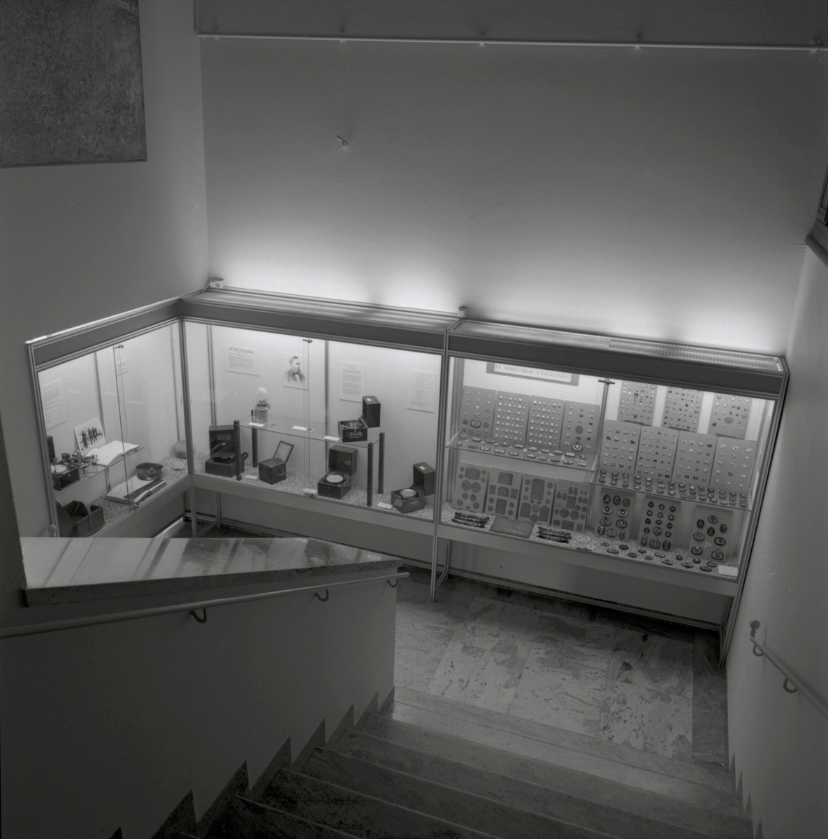 Utställningen "En märkvärdig historia". Överblicksbild av utställning i trappmonter med kompass, medaljer och märken.